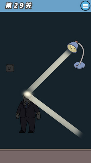 第29关:先按墙上的开关,把灯关了,然后打开台灯,经过老板头的折射,会出现通往另一个房间的按钮,然后再把墙上的开关打开,去另一个房间,就可以拿到你的手机啦。