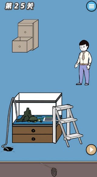 第25关:获得渔网,水管和梯子(旁边房间)后,先把水管插在地上的洞里,然后把梯子摆好,然后把渔网拖到手机的位置,即可过关。