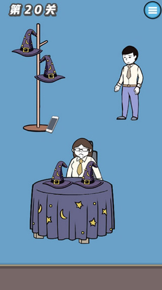 第20关:这一关非常的简单,首先等一会,让巫师用帽子把手机盖上,然后点击衣架上的两个帽子,手机就会掉出来了。