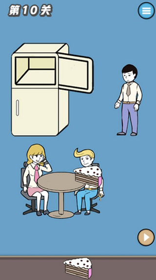第10关:从冰箱里可以获得两块蛋糕,然后给男同事一块,女同事一块,吃饱了之后他们手里的东西会掉下来,捡起女同事掉下的手机即可。